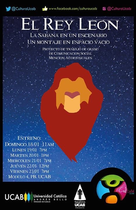 El grupo de Teatro UCAB y la Dirección de Cultura UCAB se enorgullece en presentar la mítica historia de “El Rey León” desde el domingo 18 hasta el viernes 23 de enero en sus instalaciones ubicadas en el Edificio de Aulas de la Universidad Católica Andrés Bello.
