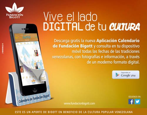 Este año Fundación Bigott estrena su calendario de fiestas tradicionales que consiste en una aplicación móvil que marca y notifica las fechas de las fiestas acompañadas de una breve descripción y fotografías. Incluye también acceso a elementos extras como la descarga de fondos de pantalla para teléfonos inteligentes y la posibilidad de proponer agregar fiestas al calendario enviando la información por correo. El calendario está disponible de forma gratuita para el sistema Android.