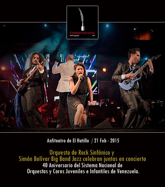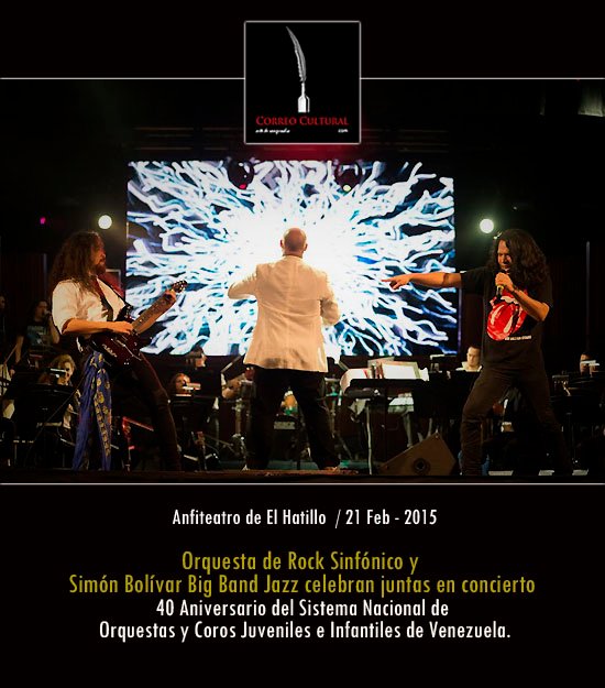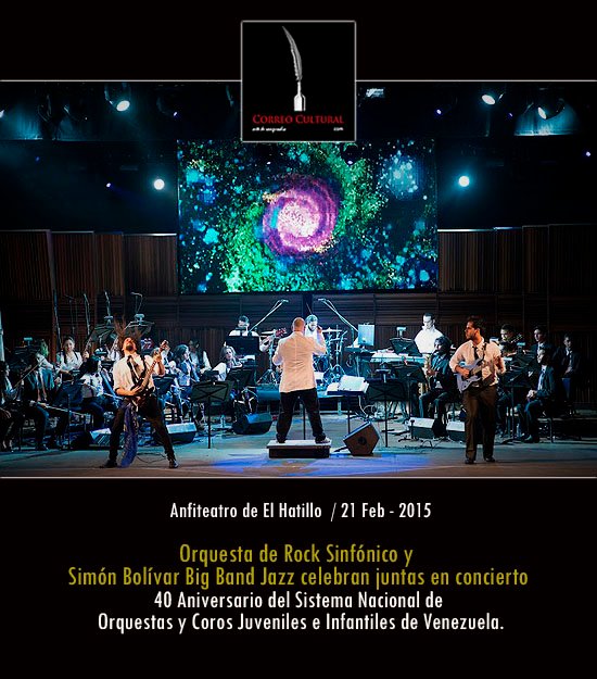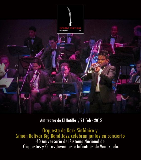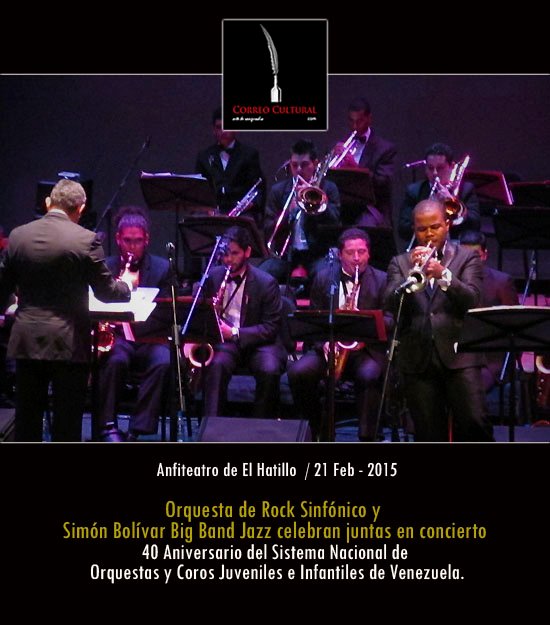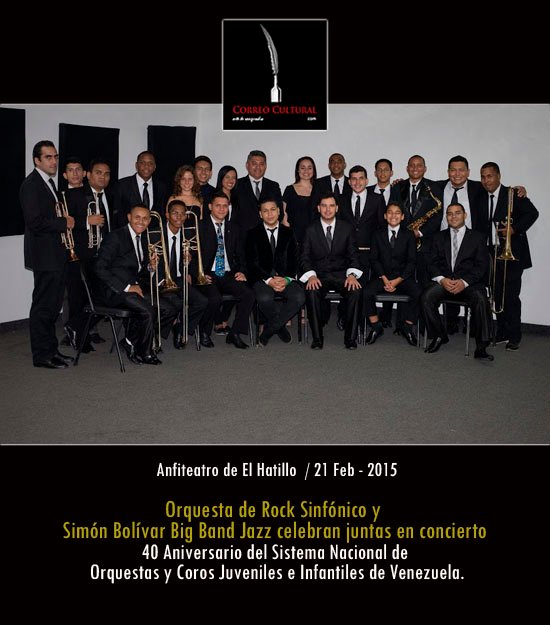Orquesta de Rock Sinfónico y Simón Bolívar Big Band Jazz celebran juntas en concierto Celebrando los 40 años del Sistema Nacional de Orquestas y Coros Juveniles e Infantiles de VenezuelaDos de las orquestas más innovadoras, la Simón Bolívar Big Band Jazz y la Orquesta de Rock Sinfónico Simón Bolívar ofrecerán un concierto juntas el sábado 21 de febrero en el Anfiteatro de El Hatillo a las 06:00 pm, en el marco de las celebración del 40 Aniversario del Sistema Nacional de Orquestas y Coros Juveniles e Infantiles de Venezuela.