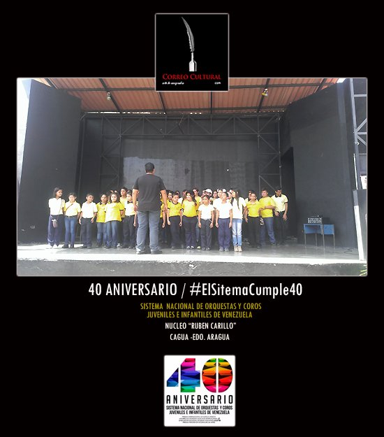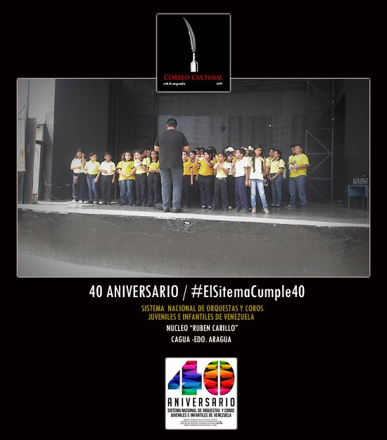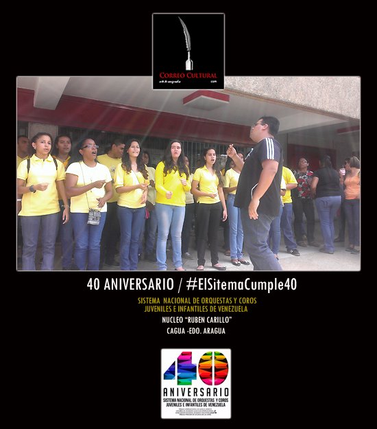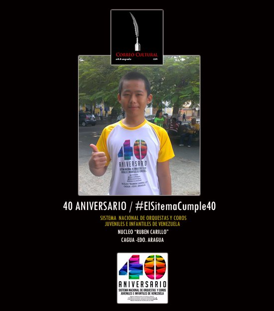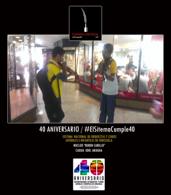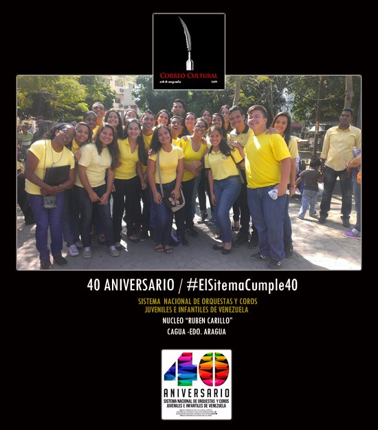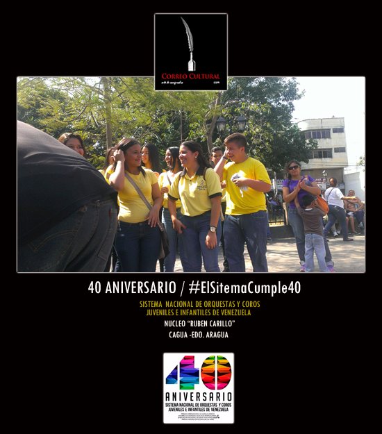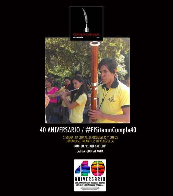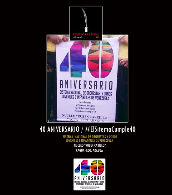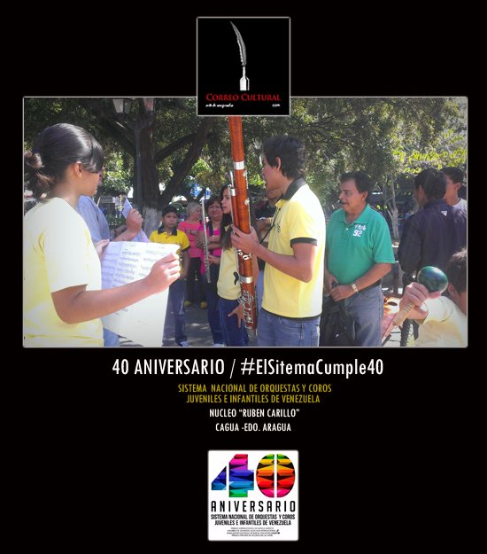 El Sistema Nacional de Coros y Orquestas Juveniles e Infantiles de Venezuela, creado por el maestro José Antonio Abreu cumple 40 años y nosotros los músicos venezolanos celebraremos este éxito con ustedes! Se realizaran una enorme cantidad de conciertos que se estarán dando en todo el país y durante todo el mes de febrero. Desde hospitales y escuelas, hasta en la casa o apto de sus vecinos o amigos. Con esto demostraremos lo influyente que es el sistema de orquestas de Venezuela. Si ven a un músico solista o en grupo realizando muestras sepan que es parte de esto así que debes tomar fotos y subirlo a tu cuenta twitter usando el ‪#‎ElSitemaCumple40 ‬para convertirlo en un fenómeno a nivel mundial y queremos que seas parte de esto! Gracias.