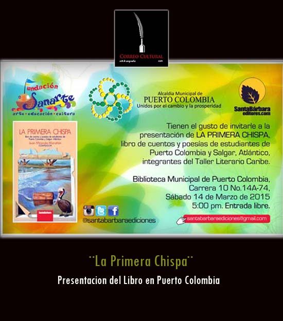 La Alcaldía Municipal de Puerto Colombia y la Fundación Sanarte presentarán el sábado 14 de marzo el libro LA PRIMERA CHISPA, libro de cuentos y poesías de estudiantes de Puerto Colombia y Salgar (Atlántico), compilado del Taller Literario Caribe bajo la dirección de Juan Miranda Marañon. Evento que se llevará a cabo en la Biblioteca Municipal, carrera 10 No.14A-74, a partir de las 5:00 PM., en Puerto Colombia (Atlántico) la entrada es libre.