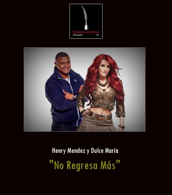 La combinación del flow electrónico tropical del dominicano Henry Mendez y la dulzura de la mexicana Dulce María, están consiguiendo arrasar en todas las pistas de baile. En España, el tema ‘No Regresa Más’ ha conseguido llegar al número 1 de iTunes en singles y videoclips y ha logrado posicionarse en los primeros puestos de las principales emisoras del país. Actualmente, el videoclip oficial ya supera los 2,2 millones de reproducciones en Youtube. ‘No Regresa Más’, grabado entre España y México, es un tema de desamor con un sonido pop mezclado con el toque de Henry Mendez. Tal y como describen sus artistas, ‘No Regresa Más’ es un tema en el que “el chico después de haberle hecho varias faenas a su novia, intenta ser perdonado, pero no hay manera. Ni el amor, ni la chica, regresan más”.