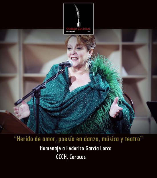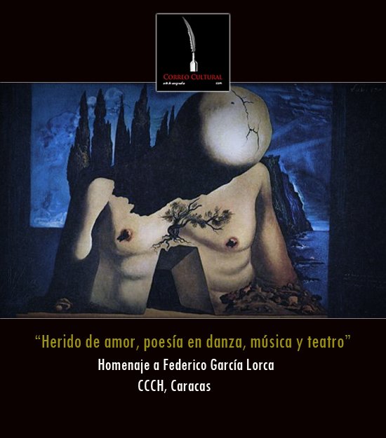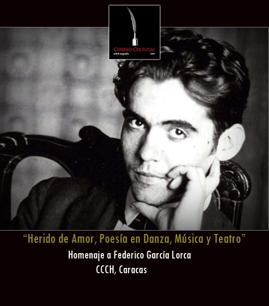 Los días sábado 21 y domingo 22 de marzo, a las 7:00 pm. y 5:00 pm. respectivamente, se realizará en el Teatro del CCCH-Centro Cultural Chacao, el espectáculo multidisciplinario “Herido de amor, poesía en danza, música y teatro”, un homenaje a Federico García Lorca (1898-1936), donde el público tendrá la oportunidad de escuchar la poesía menos conocida, junto a algunas recopilaciones versionadas y resignificadas, de la obra de este conocido poeta y dramaturgo español.