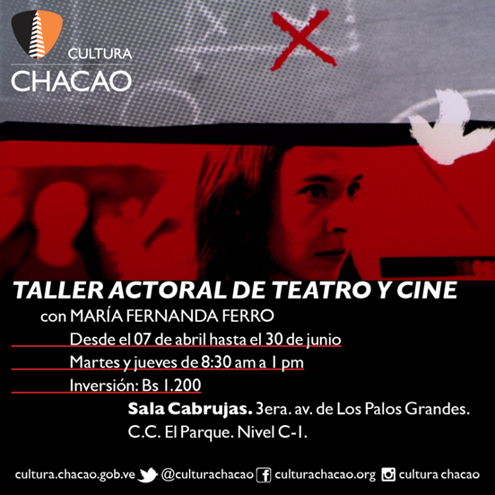 Se inició el proceso de inscripciones para el Taller Actoral de Teatro y Cine que dictará la actriz María Fernanda Ferro del 7 de abril al 30 de junio en la Sala Cabrujas de Cultura Chacao, en Los Palos Grandes, los días martes y jueves en horario de 8:30 a.m. a 1:00 p.m.