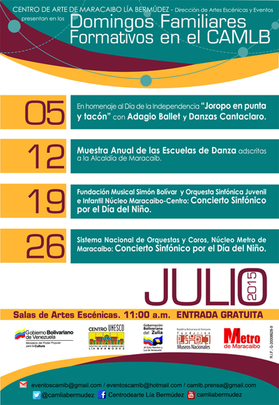 En los tradicionales Domingos Familiares Formativos en el CAMLB, la nave central se llenará de música, danza y alegría con la Muestra Anual de las Escuelas de Danza adscritas a la Alcaldía de Maracaibo, quienes harán gala de todo su trabajo y esfuerzo durante todo el año escolar. La invitación es para toda la familia y es completamente gratis, a partir de las 11 de la mañana.
