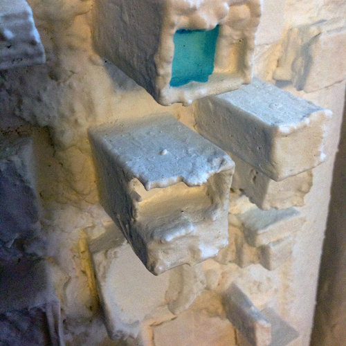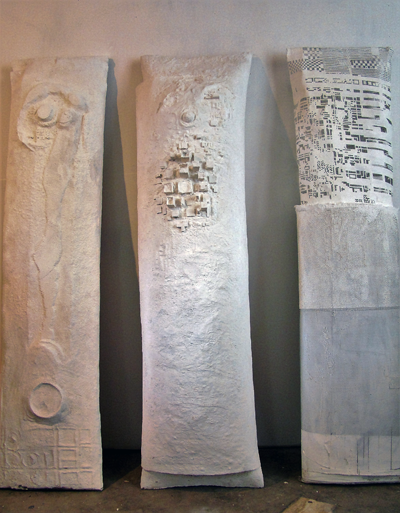 Nuevamente, Machado recurre en su obra al cemento, material que ha trabajado durante los últimos años para plasmar con ellos paisajes y formas petrificadas, vistas desde el espacio, como reliquias de un pasado destruido. Igualmente, moldea el alambre de hierro galvanizado y los interviene con color, mostrando un meticuloso trabajo que sorprende por su detalle y evoca la era digital en la que vivimos.