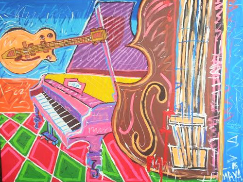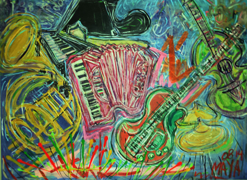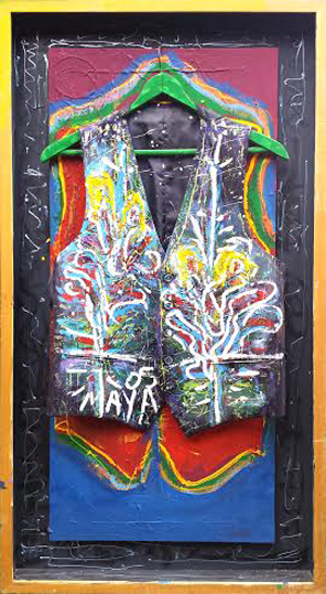 Una “fiesta de color” es su trabajo, predominantemente expresivo, producto de una suerte de azar ideado y ejecutado sin enmienda posible. Yuxtaposiciones sin mezcla en la paleta, entorchados delirantes urgidos de llenar espacios vacíos, todo ello y más conforman la estructura sobre la cual el artista Néstor Maya hila y teje su poesía barroca plástica.