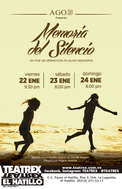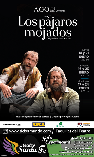 Soraya Siverio, Lucrecia Baldassarre, Carlos Domínguez y Unai Amenábar protagonizan Memoria del silencio, adaptación de la novela de Uva de Aragón, que se estará presentando el viernes 22, sábado 23 y domingo 24 en Teatrex del Hatillo. Los pájaros mojados cuenta con las actuaciones de Agustín García y Wilfredo García. Escrita por el chileno José Yovane y con música original en vivo de Nicolás Barreto, tomará las tablas del teatro Santa Fe los días 14, 16, 17, 21, 23 y 24 de este mes.