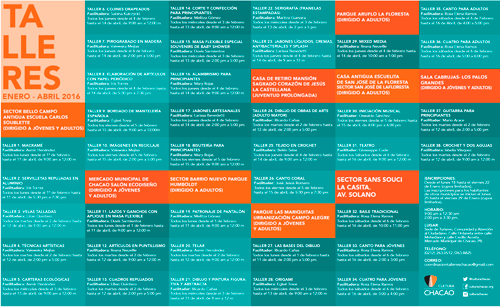 Se inició el proceso de inscripciones para el ciclo de Talleres Chacao correspondiente al 1er trimestre del año 2016, que ofrecerá Cultura Chacao a partir del lunes 1° de febrero en diferentes espacios del municipio, como parte de su programación formativa para jóvenes y adultos, destinada al aprendizaje no formal en diversas áreas de la creación artística y artesanal.