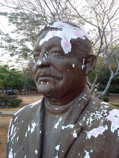 Vuelvo a la plaza del sin-sentido, rodeada por un tráfico infernal pero lejos de todo lo relacionado con la gaita, la tradición y la vida de Astolfo Romero. Allí está el catire con sus bigotes, no tiene placa ni leyenda, solo su busto de yeso y cemento, con su figura lacerada, sin el menor cuidado, abandonado a una triste suerte.