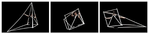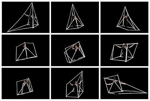 Al entrar a una segunda instancia de la exhibición inmediatamente nos alojarán las obras del arquitecto Miguel Braceli y del escultor Luis Millé. La proyección en dos monitores de gran formato de la CasaCuerpo (2016) de Miguel Braceli nos muestra una investigación definida por el propio autor como: «la amplificación de la caja del cuerpo desplazando sus límites para habitar en él. Se plantea como un modelo mecánico donde toda construcción nace del cuerpo transformado en espacio. Así, el cuerpo como espacio aumentando convierte al individuo en usuario y contexto a la vez». Esta fastuosa obra escultórica/performática dirigida por el arquitecto y realizada con estudiantes de arquitectura como parte del Taller X, nos ayuda a introducirnos a la gran instalación del escultor Luis Millé, quien se empeña a través de sus Flexometrías en hacernos vivir la obra y no tan sólo contemplarla, al dejarnos entrar en ella tal y como los pioneros maestros modernos nos enseñaron (remitiendo a la Reticulárea de GeGo y los penetrables de Jesús Soto) a vivir y a convivir en el arte, sin pasividad alguna.