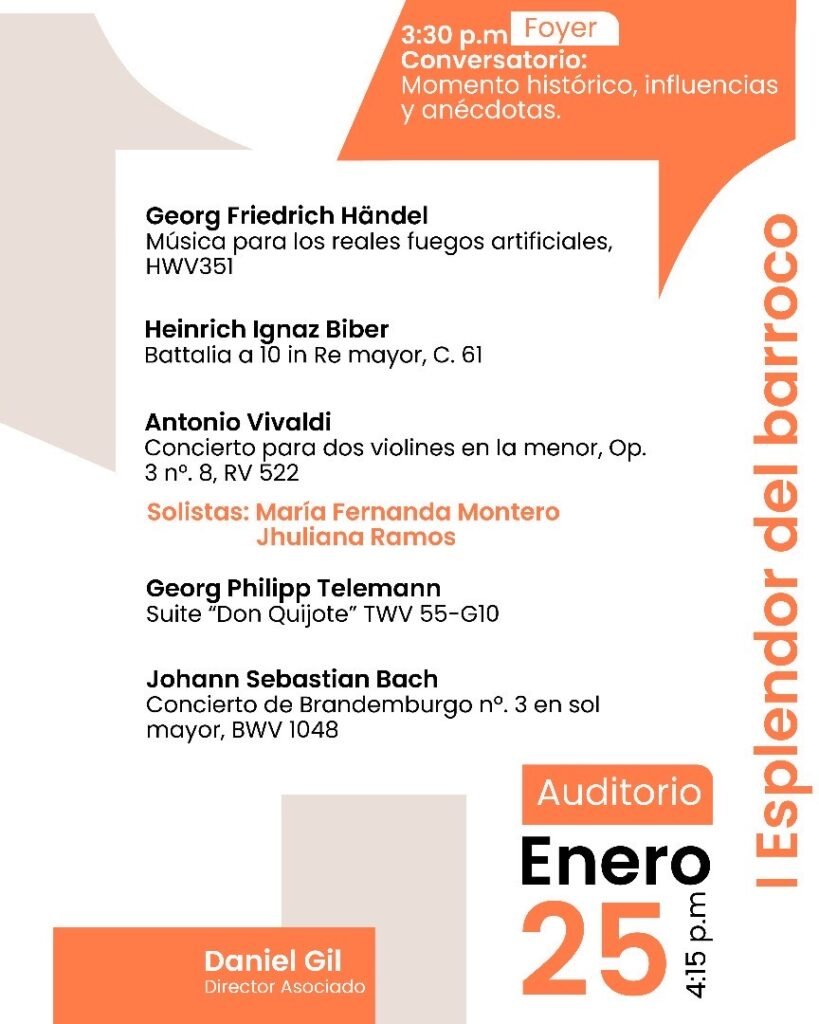El ciclo comenzará el sábado 25 de enero con el concierto Esplendor del Barroco, que ofrecerá una selección de piezas representativas y significativas. El programa incluirá Música para los reales fuegos artificiales de Georg Friedrich Händel, Battalia a 10 in Re mayor de Heinrich Ignaz Biber, Concierto para dos violines en la menor, Op. 3 nº. 8 RV 522 de Antonio Vivaldi, Suite «Don Quijote» de Georg Philipp Telemann y Concierto de Brandemburgo nº. 3 en sol mayor, BWV 1048 de Johann Sebastian Bach. En esta ocasión, las solistas serán la concertino María Fernanda Montero y la Asistente al concertino Jhulianna Ramos, bajo la dirección del maestro Daniel Gil.