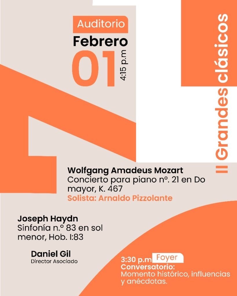El segundo concierto, titulado Grandes Clásicos, se llevará a cabo el sábado 1 de febrero con el repertorio de: Wolfgang Amadeus Mozart y Joseph Haydn. El programa incluirá el Concierto para piano nº. 21 en Do mayor, K. 467 de Mozart, interpretado por el solista Arnaldo Pizzolante, y la Sinfonía nº. 83 en sol menor, Hob. 1:83 de Haydn.