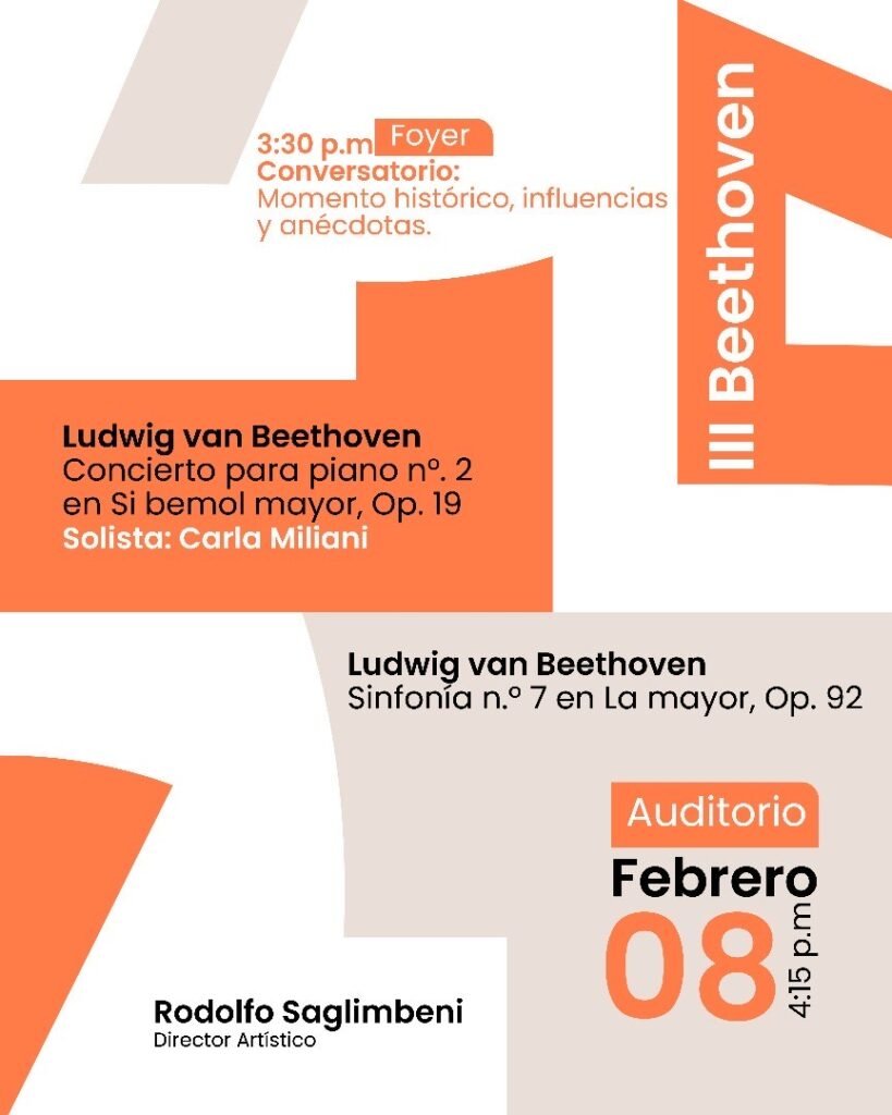 El sábado 8 de febrero, el ciclo continuará con un homenaje a Ludwig van Beethoven en el concierto titulado Beethoven. En este evento, Carla Miliani será la solista encargada de interpretar el Concierto para piano nº. 2 en si bemol mayor, Op. 19 de Beethoven, que será complementado por la interpretación de la Sinfonía nº. 7 en La mayor, Op. 92 bajo la batuta de nuestro Director Artístico, el maestro Rodolfo Saglimbeni.