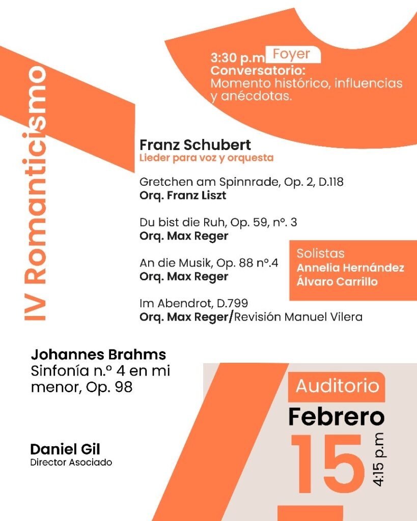 El sábado 15 de febrero, el ciclo se adentrará en el Romanticismo con un programa que incluye los Lieder para voz y orquesta de Franz Schubert, con arreglos de Max Reger, y la Sinfonía nº. 4 en mi menor, Op. 98 de Johannes Brahms. Las solistas invitadas para esta ocasión serán Annelia Hernández (soprano) y Álvaro Carrillo (barítono).