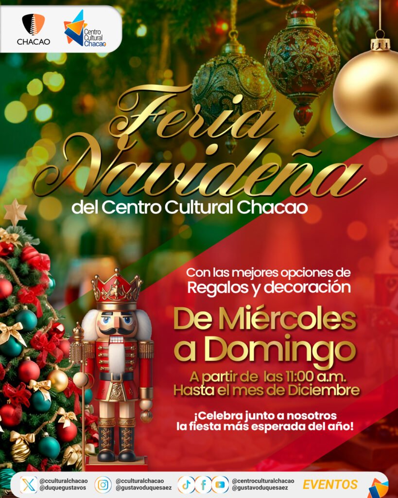 La época más festiva del año se adelanta en el municipio Chacao. El Centro Cultural Chacao anuncia la celebración de su Feria Navideña, un evento diseñado para que el público caraqueño inicie la búsqueda de los mejores regalos y detalles con tiempo, en un ambiente cultural y seguro.