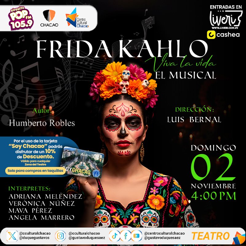 El domingo 2 de noviembre a las 4:00 pm. llega al Centro Cultural Chacao la celebración del día de muertos, con el espectáculo de teatro musical «Frida Kahlo: Viva la vida», La pieza que se ha representado en más de 30 países, centrada en la vida y obra de la icónica artista mexicana Frida Kahlo, escrita por el dramaturgo mexicano Humberto Robles y dirigida por el venezolano Luis Bernal.