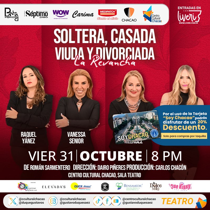 Vanessa Senior, Flavia Gleske, Liliana Meléndez y Raquel Yánez, darán vida a la divertida pieza teatral “Soltera, Casada, Viuda y Divorciada, La Revancha” en el Centro Cultural Chacao con una única función: este viernes 31 de octubre a las 8:00 p.m . Y cuyas entradas se pueden adquirir de en las taquillas del teatro o en la página web: b: www.liveri.com.ve.