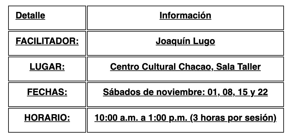 AGENDA SEMANAL DEL CENTRO CULTURAL CHACAO, DESDE EL JUEVES 30 DE OCTUBRE AL DOMINGO 02 DE NOVIEMBRE