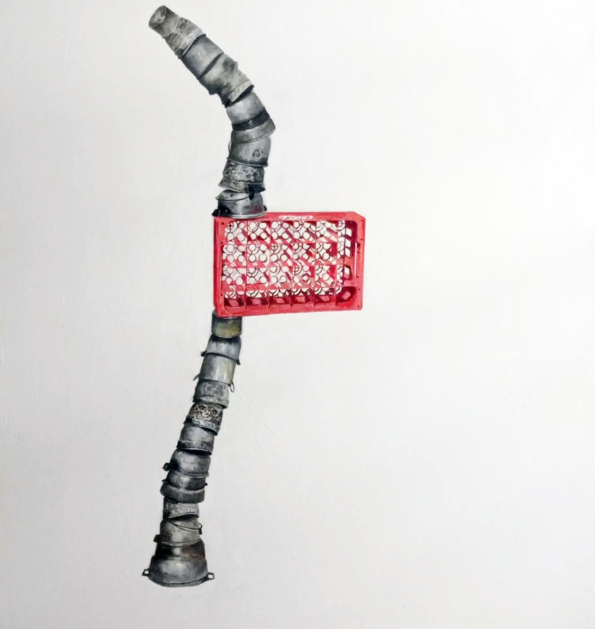 La caja roja —contenedor sin contenido— introduce una tensión entre orden y abandono, entre el impulso de guardar y la imposibilidad de retener. Su geometría industrial contrasta con la organicidad irregular del tubo, creando una imagen que oscila entre escultura y pintura, entre objeto y signo.