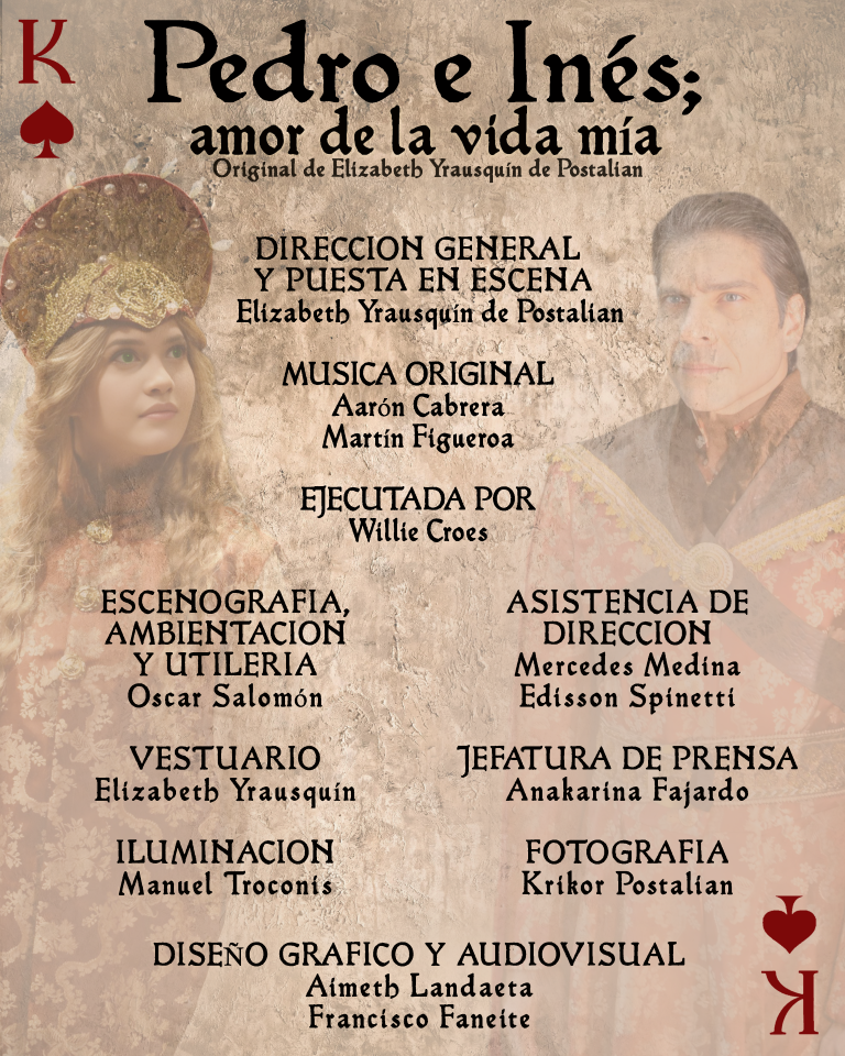 Escrita y dirigida por Elizabeth Yrausquín de Postalian, y producida por la Fundación Asklepión, “Pedro e Inés: Amor de la vida mía” invita a una importante reflexión acerca de temas que corresponden a cuestiones sociales, políticas y morales aparentemente propias del Medioevo, en este caso, en el reino de Portugal del siglo XIV, donde el Rey es considerado representante directo de Dios en la Tierra. Sin embargo, los problemas fundamentales presentados en esta pieza tienen vigencia en la actualidad: los derechos humanos en general y, dentro de estos, los femeninos; así como el ejercicio del poder absoluto y arbitrario.