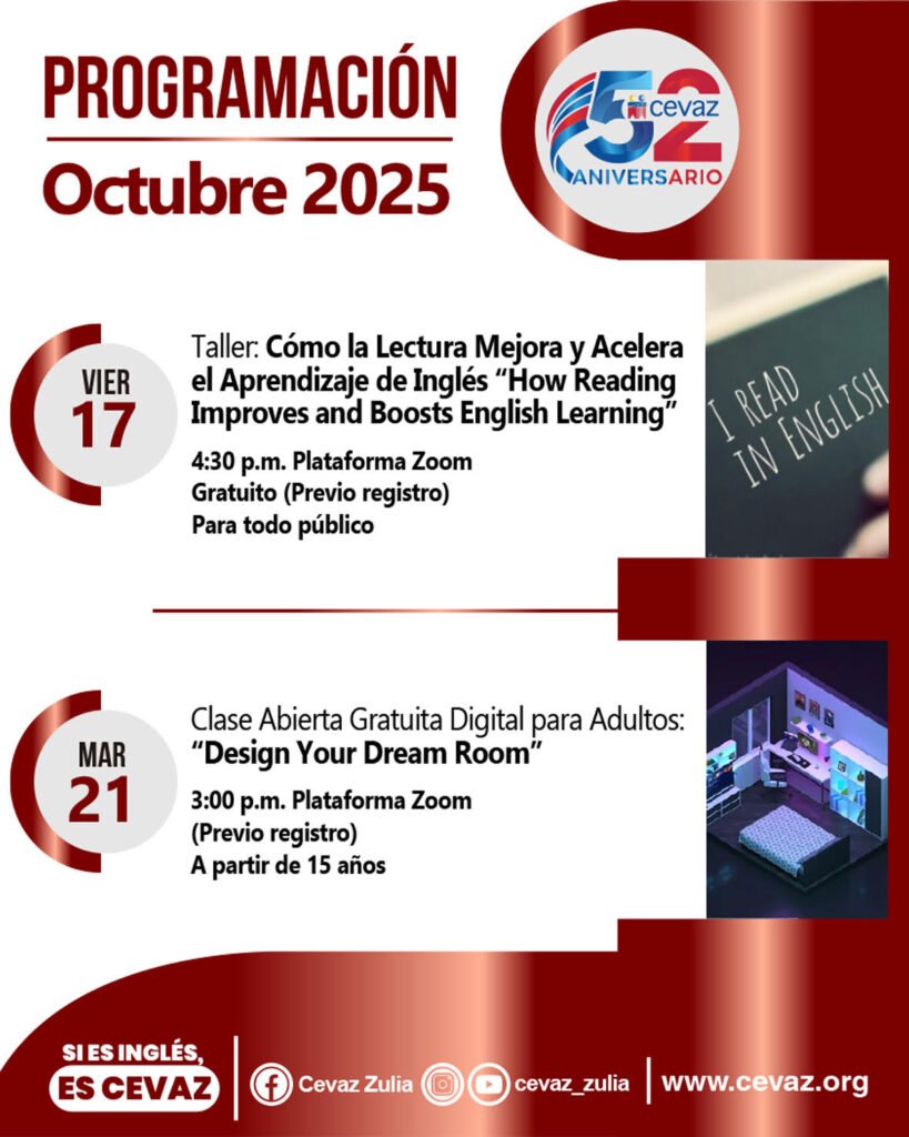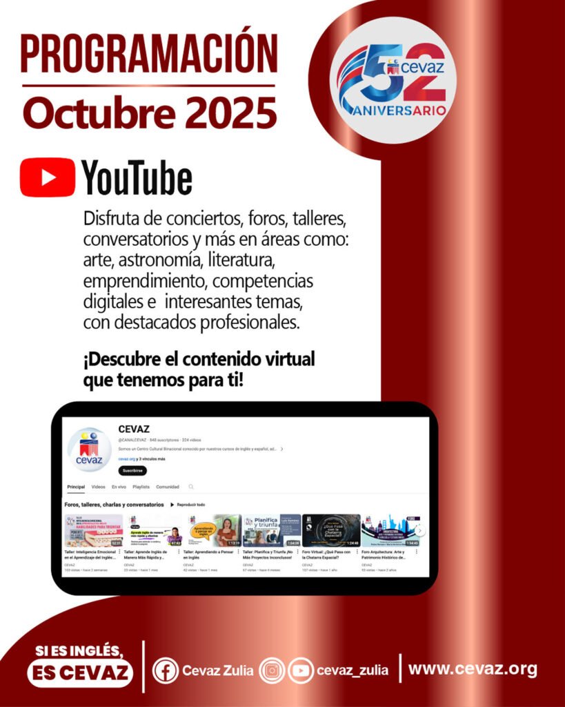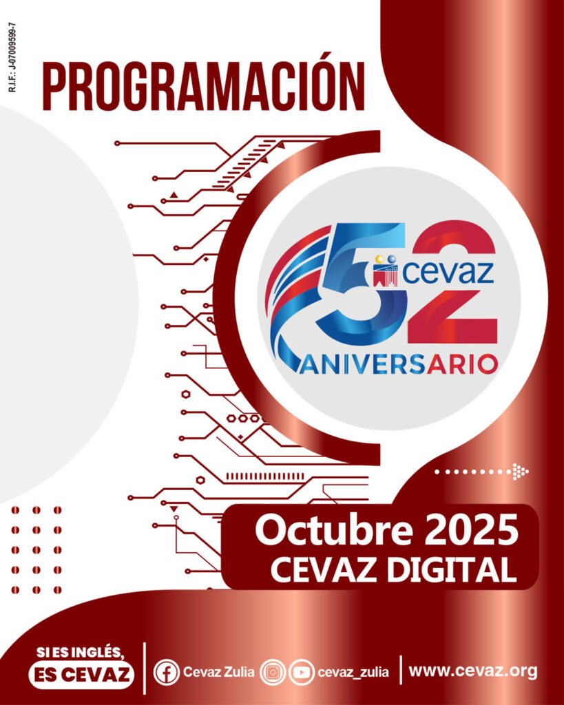In Educación, Eventos Programación de CEVAZ Digital para octubre 2025 3 octubre, 2025 Pin It Días antes a la realización del evento de su interés, estaremos compartiendo el link de registro en nuestra biografía de Instagram, a través de linktr.ee/cevaz_zulia Maracaibo, Zulia, Venezuela Octubre, 2025 Compártelo:Haz clic para compartir en Twitter (Se abre en una ventana nueva)Haz clic para compartir en Facebook (Se abre en una ventana nueva) Relacionado #52AniversarioCevaz#Aprendizaje#Cevaz#ClasesAbiertas#CulturaDigital#Inglés#TalleresOnline Share Previous Post Carlos Rojas representará por… In Arte & Cultura Carlos Rojas representará por primera vez a UNEARTE en el XIV Congreso Internacional El Cuerpo en el Siglo XXI en Bogotá. View Post Next Post FONSECA estrena el videoclip oficial… In Eventos FONSECA estrena el videoclip oficial de su éxito “Nunca Me Fui” junto a RUBEN BLADES View Post