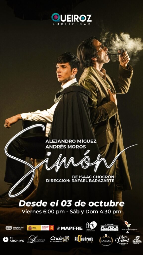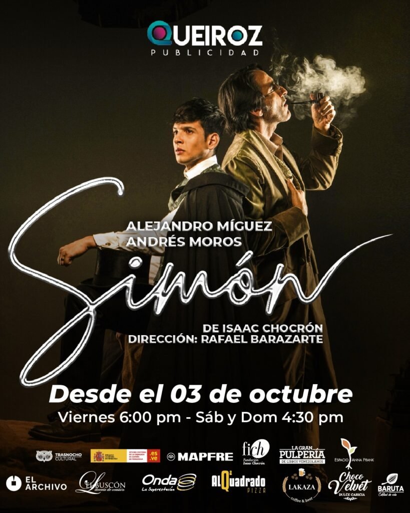A partir del 03 de octubre el público disfrutará de un cálido y conmovedor relato sobre la amistad entre Simón Rodríguez interpretado por Alejandro Míguez y un joven Simón Bolívar interpretado por Andrés Moros, durante el tiempo que compartieron en Europa. Una obra producida por Queiroz Publicidad con el apoyo de Mapfre, dirigida por Rafael Barazarte. Rindiendo homenaje en sus 95 aniversarios a uno de los dramaturgos más importantes del país, Isaac Chocrón. Viernes a las 6:00pm, sábados y domingos a las 4:30pm. Más información en www.trasnochocultural.com