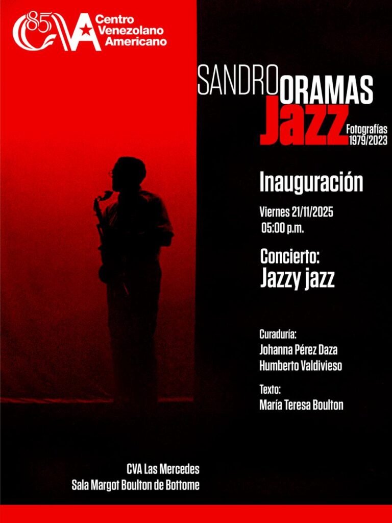 Una exposición titulada “Jazz. Fotografías 1979/2023”, del fotógrafo Sandro Oramas, será inaugurada en la Sala Margot Boulton de Bottome del CVA Las Mercedes, el 21 de noviembre de 2025 a las 5:00 p.m., bajo la curaduría de Johanna Pérez Daza y Humberto Valdivieso, con texto de María Teresa Boulton, en el marco del ciclo de exposiciones que lleva a cabo el Centro Venezolano Americano dentro de su programación cultural.