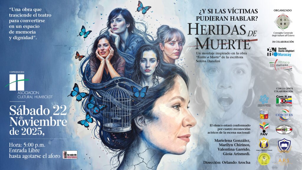 La escena cultural de Caracas se prepara para recibir una de las propuestas más significativas y urgentes de la temporada: «Heridas de Muerte». Esta producción, inspirada en la obra Ferite a Morte de la escritora italiana Serena Dandini, surge de una importante colaboración entre el Consejo General de los Italianos en el Exterior – Venezuela (CGIE), la Società Dante Alighieri de Maracay y el Instituto Italiano de Cultura de Caracas, en coproducción con la Asociación Cultural Humboldt. La única función tendrá lugar el sábado 22 de noviembre de 2025, a las 5:00 p.m., en la Asociación Cultural Humboldt, ubicada en San Bernardino, Caracas, con entrada libre hasta agotar el aforo.