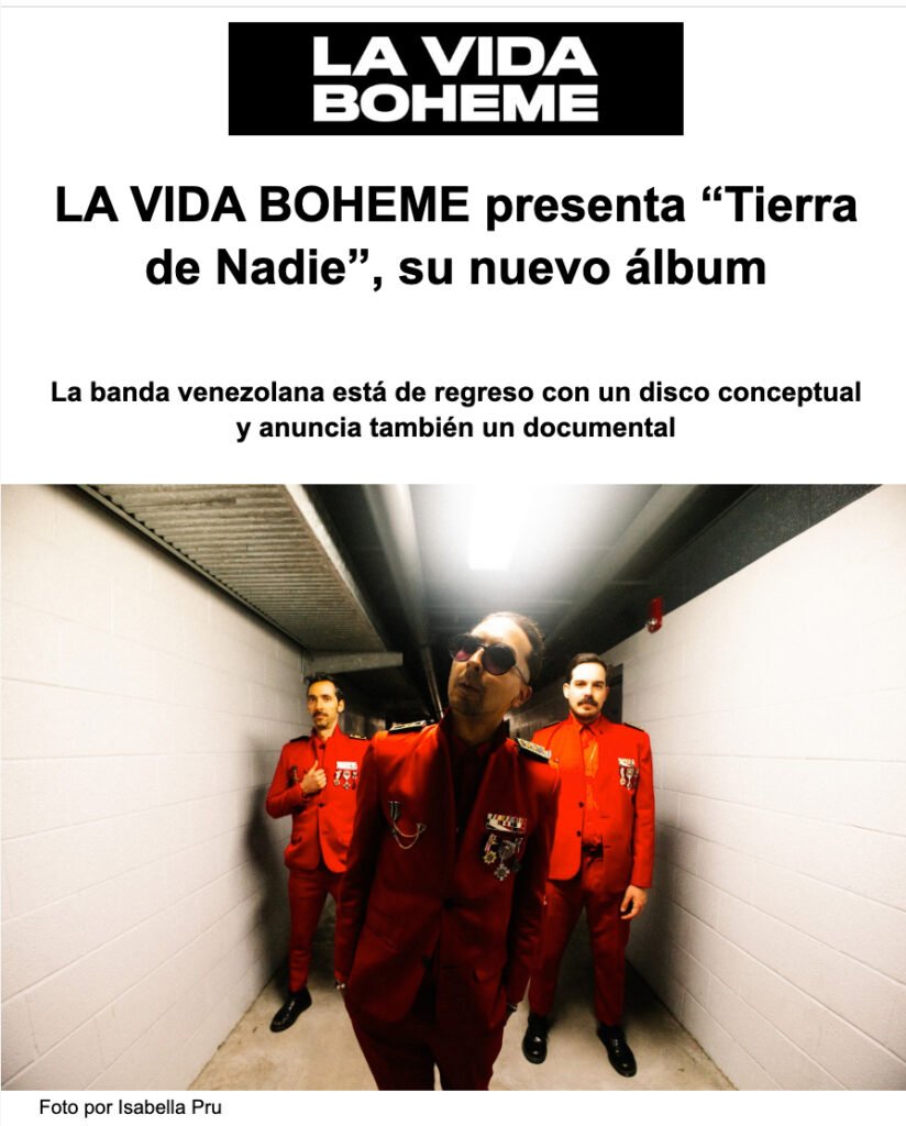 La reconocida banda venezolana LA VIDA BOHEME, una de las agrupaciones más influyentes del rock latinoamericano de los últimos años, acaba de publicar su quinto álbum de estudio, “Tierra de Nadie”, el cual ya está disponible en todas las plataformas digitales y cuenta con una edición limitada en formato vinilo.
