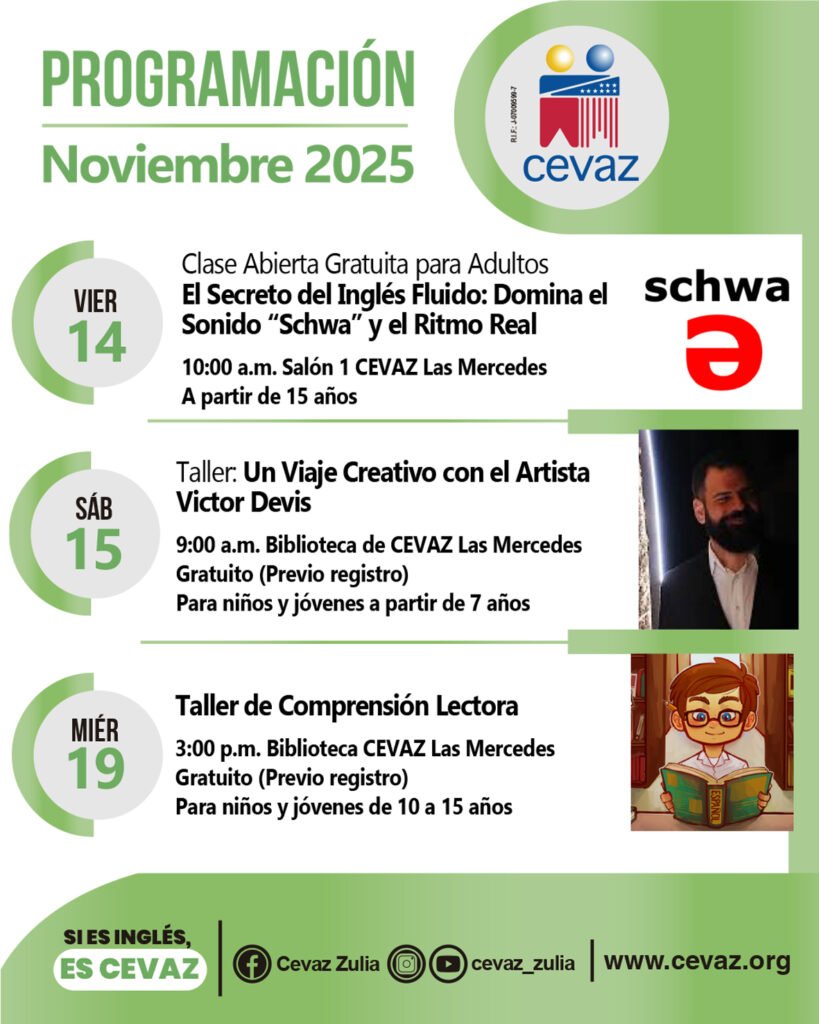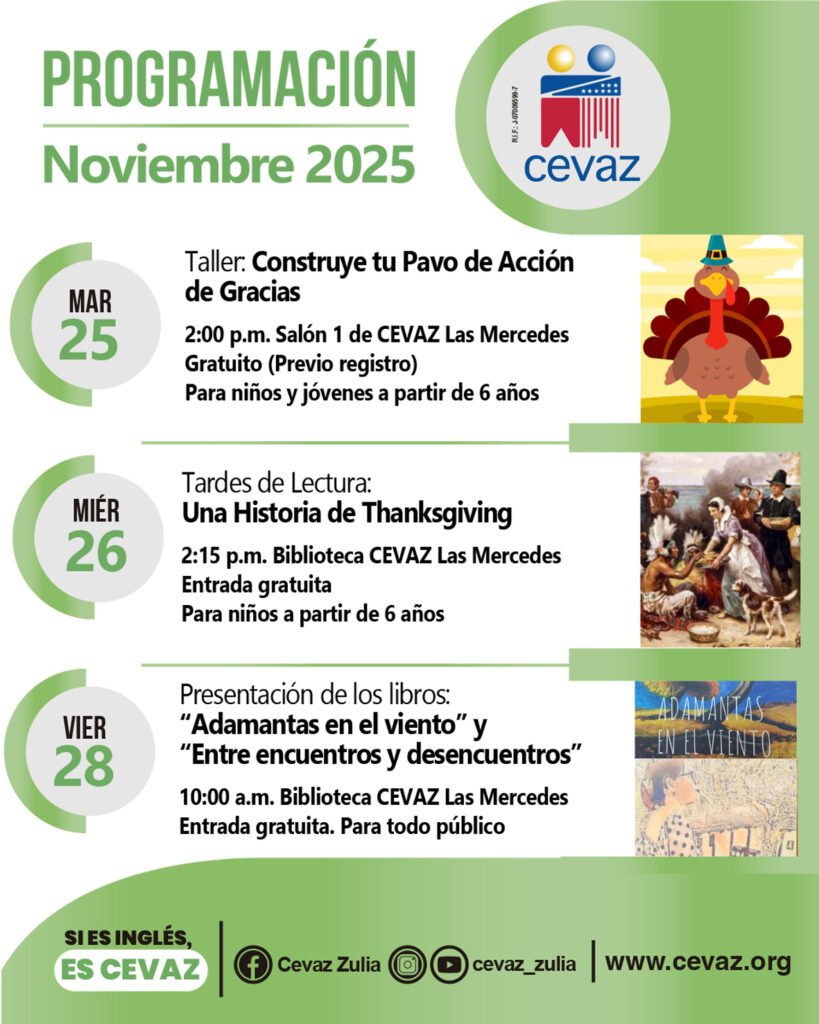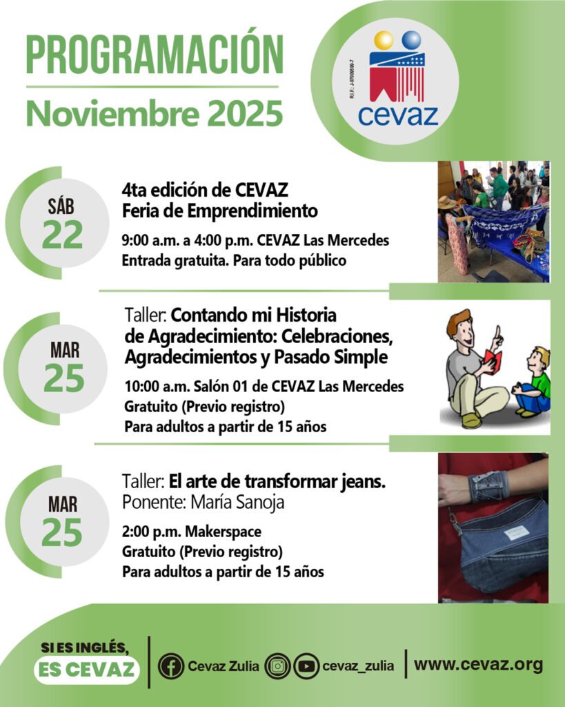 In Educación, Eventos Programación de Actividades de CEVAZ Las Mercedes para noviembre 2025 5 noviembre, 2025 Pin It Días antes a la realización del evento de su interés, estaremos compartiendo el link de registro en nuestra biografía de Instagram, a través de linktr.ee/cevaz_zulia MARACAIBO, ZULIA VENEZUELA Noviembre, 2025 Compártelo:Haz clic para compartir en Twitter (Se abre en una ventana nueva)Haz clic para compartir en Facebook (Se abre en una ventana nueva) Relacionado #CentroBinacional#Cevaz#CulturaCEVAZ#CulturaYAprendizaje#CulturaZuliana#EducaciónBilingüe#InglésParaTodos#NoviembreCEVAZMaracaibo Share You may also like View Post CBA y ATEA festejan el Día Nacional del Teatro con “El Juego” de Mariela Romero View Post En Maracaibo “La Casa Teatro” exhibirá plástica, teatro y música View Post Programación semanal y mensual de PDVSA La Estancia Maracaibo Previous Post “Ávila Vertical”: Jorge Luis… In Eventos “Ávila Vertical”: Jorge Luis Santos convierte la montaña caraqueña en un retrato íntimo y monumental View Post