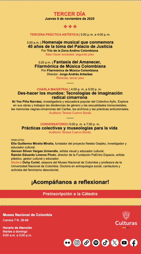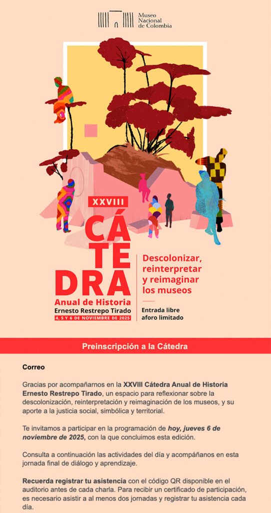 In Periodismo ¡Prográmate con la XXVIII Cátedra Anual de Historia Ernesto Restrepo Tirado! 6 noviembre, 2025 Pin It Museo Nacional de Colombia Carrera 7 N. 28-66 Horario de Atención Martes a domingo 9:00 a.m. a 5:00 p.m. Bogotá D.C. Colombia Noviembre, 2025 Compártelo:Haz clic para compartir en Twitter (Se abre en una ventana nueva)Haz clic para compartir en Facebook (Se abre en una ventana nueva) Relacionado #CátedraRestrepoTirado#CulturaViva #Museos#Descolonización#EducaciónCultural#Museología#MuseoNacionaldeColombiahistoria Share You may also like View Post El encanto de una niña en “Una Mirada al mar” View Post ARTBO | Stand A21, Galería La Cometa. Previous Post Arte en Movimiento |… In Arte & Cultura Arte en Movimiento | Art in Motion View Post Next Post Alex Bueno revive “Navidad Sin… In Eventos Alex Bueno revive “Navidad Sin Mi Madre" con un emotivo vídeo creado con Inteligencia Artificial. View Post