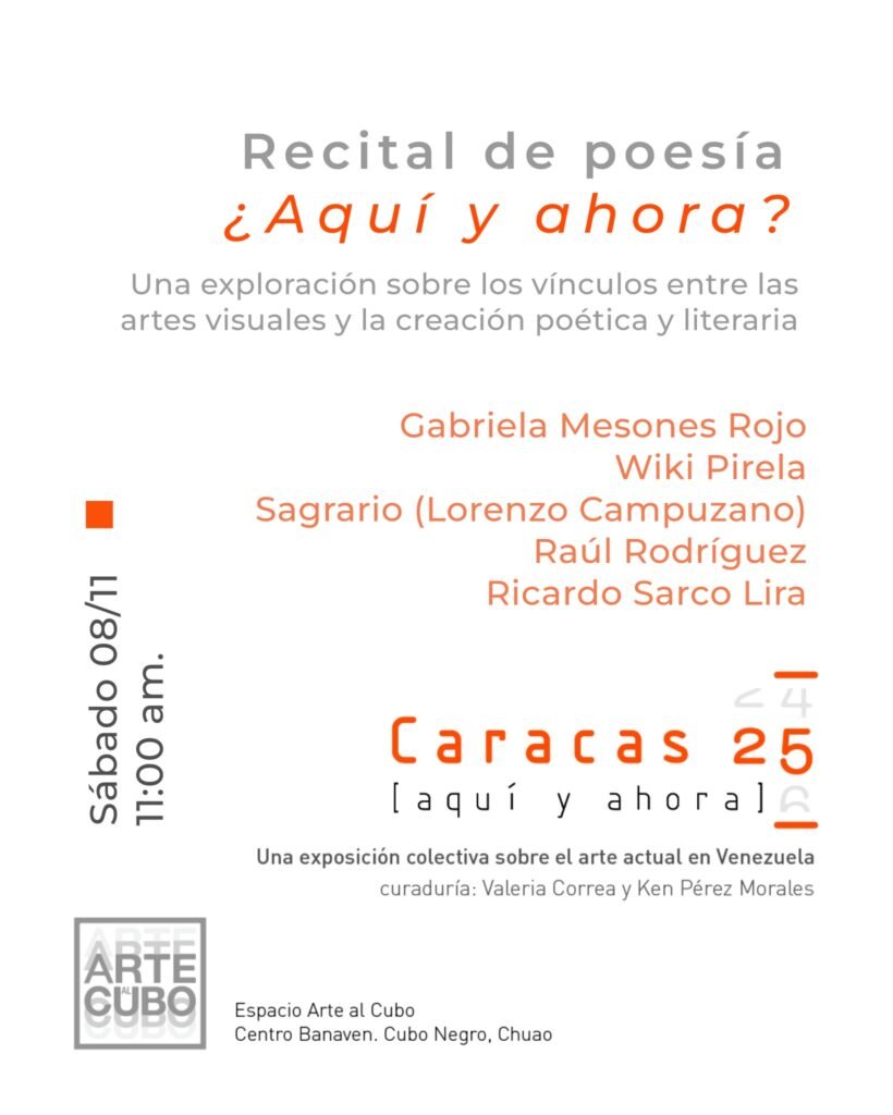 En el marco de la exposición colectiva de jóvenes artistas “Caracas 25. Aquí y ahora”, que se presenta actualmente en Espacio Arte al Cubo, se ofrecerá un recital de poesía este sábado 8 de noviembre de 2025 a las 11:00 a.m., en torno a las relaciones posibles entre las artes visuales y la creación poética y literaria.