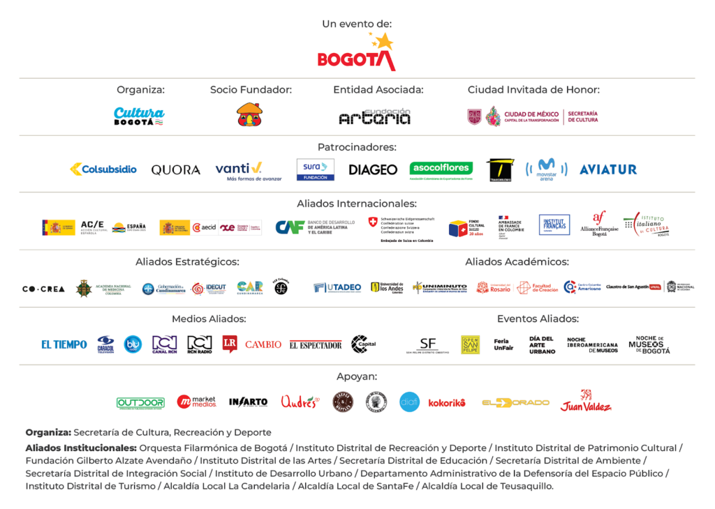 La Bienal Internacional de Arte y Ciudad BOG25, organizada por la Alcaldía Mayor de Bogotá a través de la Secretaría de Cultura, Recreación y Deporte, es posible gracias al apoyo de Davivienda como socio fundador, y al respaldo de entidades internacionales de cooperación, embajadas, empresas del sector privado, universidades nacionales e internacionales y aliados mediáticos e institucionales. Una suma de voluntades que hace posible esta apuesta cultural para la ciudad.