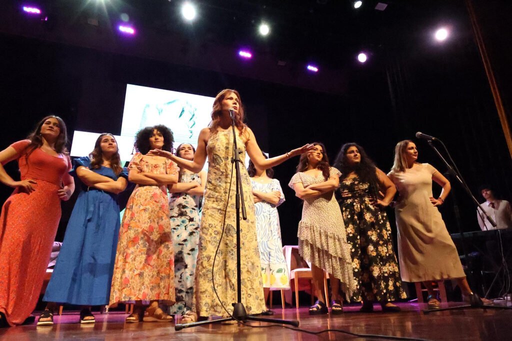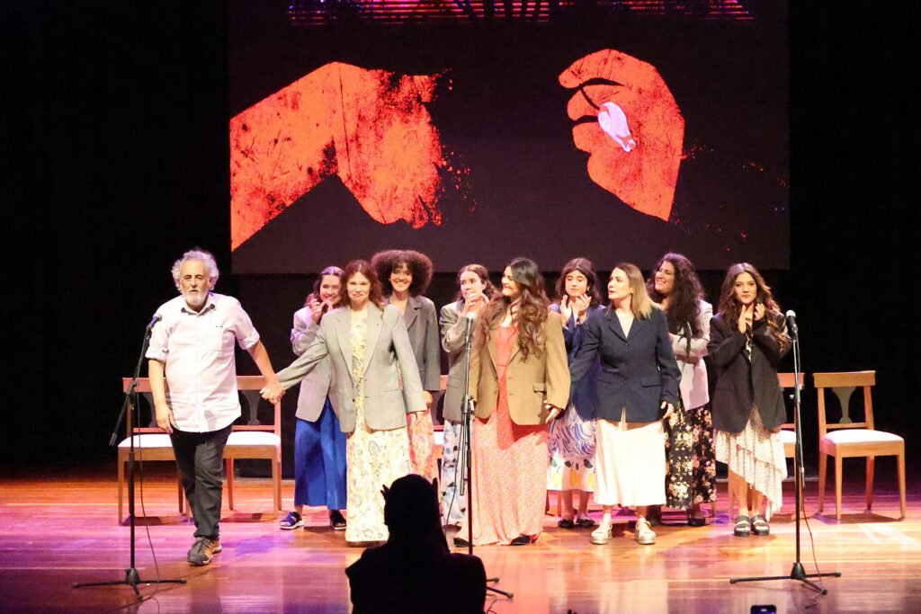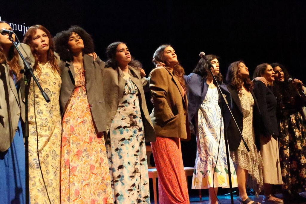 El momento culminante de la velada llegó de la mano de la cantante Deborah Emperatriz, cuya presentación final transformó la conmoción en catarsis colectiva. Tras el desgarrador recorrido por las historias, su voz se alzó para entonar una selección estratégica de canciones que funcionaron como un viaje emocional de sanación: comenzando con la resignación de «Equivocada» de Thalía, pasando por la resiliencia de «Sobreviviré» de Mónica Naranjo, y culminando con la fuerza himno de Bebe, «Ella». Esta última pieza, convertida en un grito colectivo de empoderamiento y solidaridad, unió a actrices, coro y público en una sola voz, transformando el dolor en potencia.