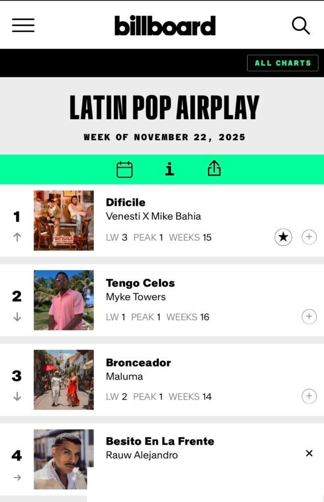 Este nuevo logro es el cuarto número 1 que alcanza el artista de Guapi en los charts de Billboard, después de sus singles ‘Umaye« en el 2023, «No Es Normal» en el 2024, «Fuera de lugar» a inicios de este 2025 y el 22 de noviembre con «Difícile« junto a Mike Bahía.
