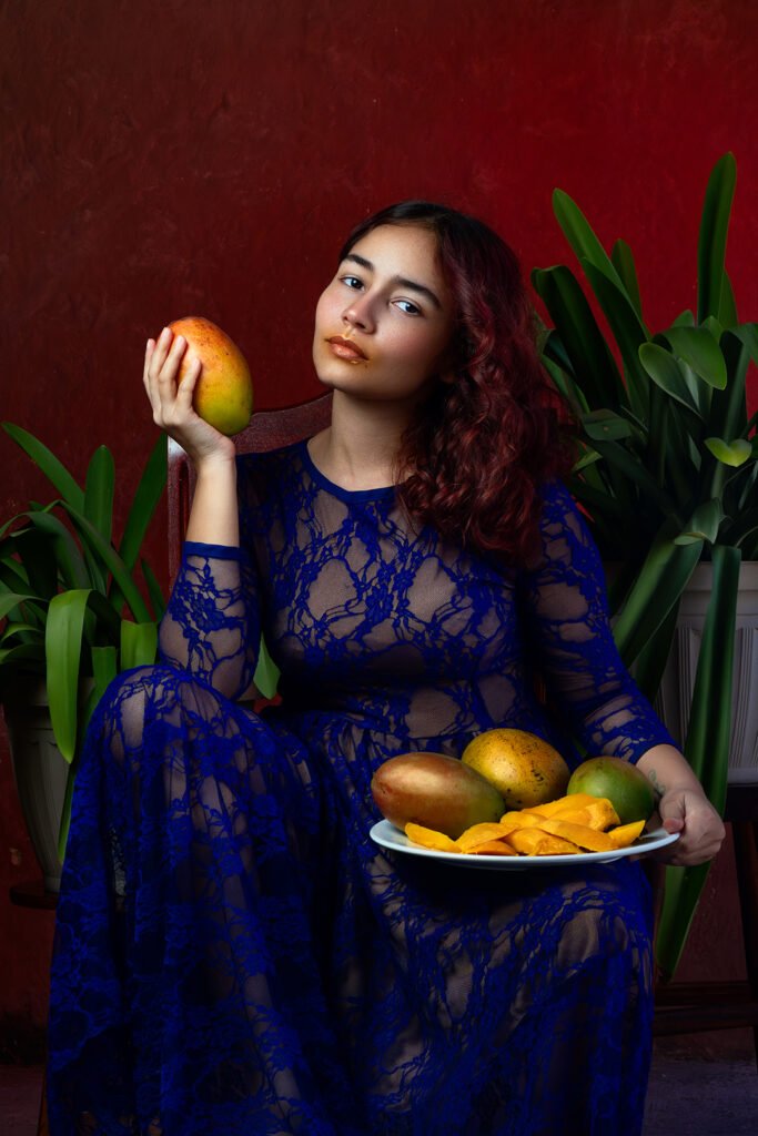 El trabajo de Yus Mejías desmantela los códigos de la representación femenina tradicional. “Vivimos en una sociedad que dicta cómo debe ser una mujer, hasta en los colores que usa”, afirma. En su serie Señorita, esa imposición se subvierte desde la belleza: flores, frutas, telas y colores vibrantes funcionan como un lenguaje de seducción visual que a la vez interpela al espectador.