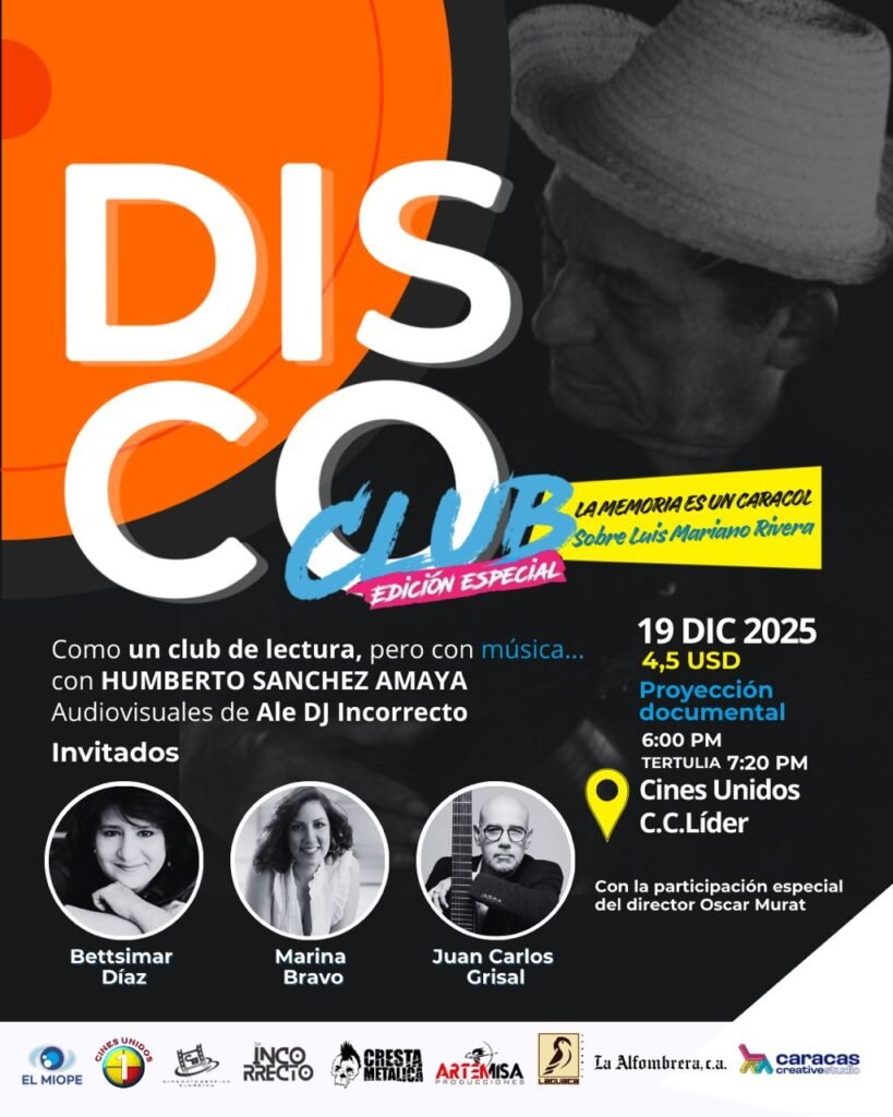 Esta edición especial de Disco Club será el viernes 19 de diciembre de 2025 a las 6.00 pm en Cines Unidos del Centro Comercial Líder, en Caracas. Primero se verá el documental y luego se llevará a cabo la tertulia. La entrada tiene un costo de 4,5 USD.