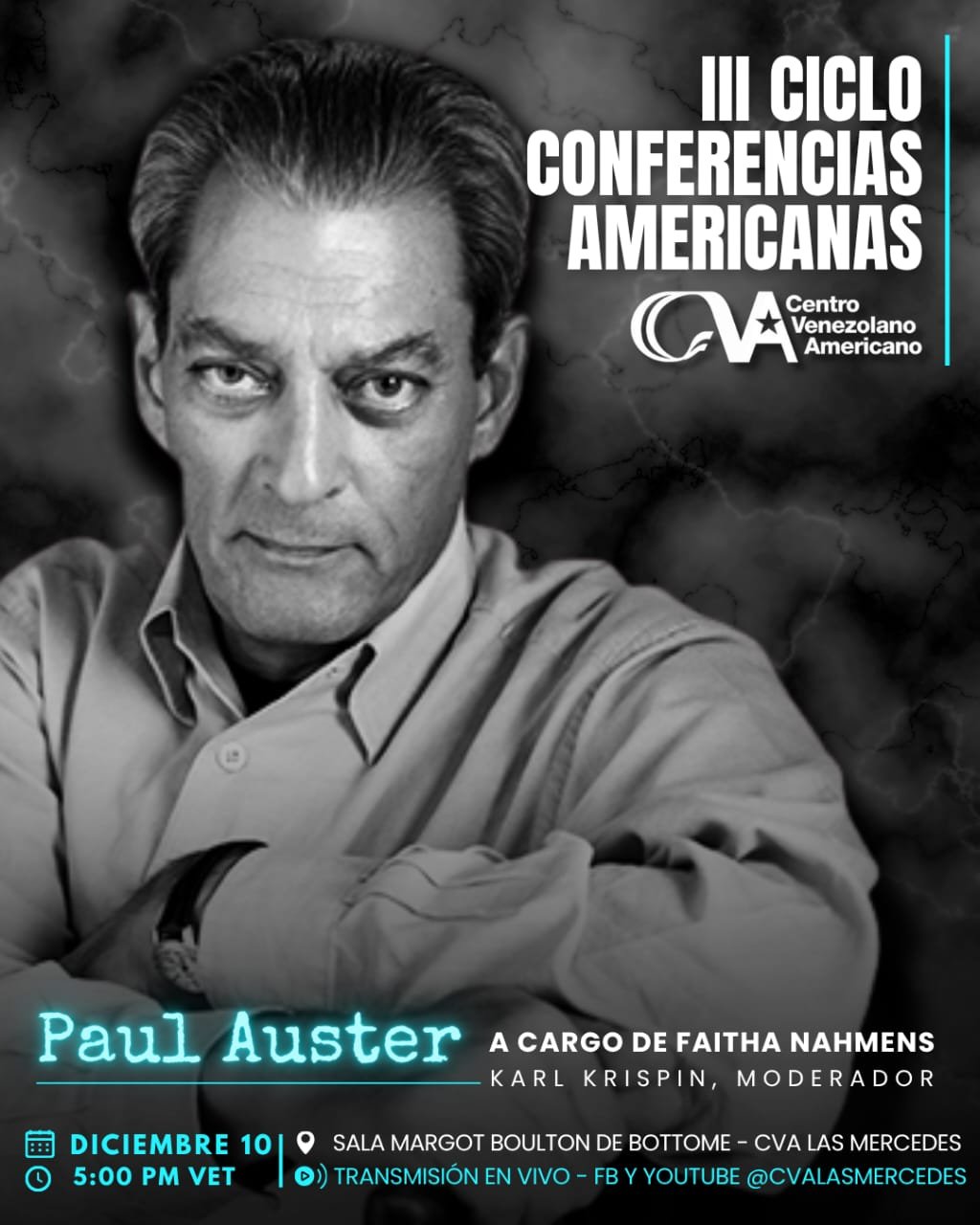 El miércoles 10 de diciembre de 2025, a las 5:00 p.m., culminará el III Ciclo de Conferencias Americanas que lleva a cabo el Centro Venezolano Americano, con una conferencia a cargo de la periodista venezolana Faitha Nahmens Larrazábal sobre el escritor estadounidense Paul Auster, que moderada por Karl Krispin, tendrá lugar en la Sala Margot Boulton de Bottome del CVA Las Mercedes.