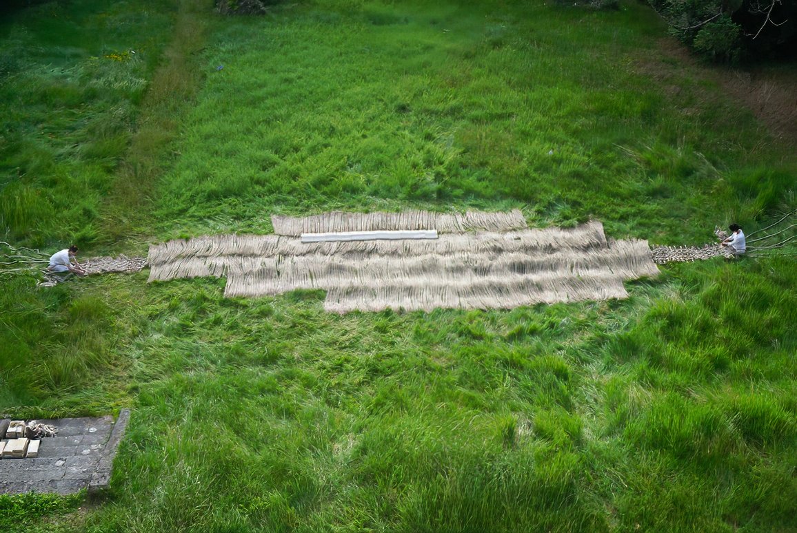 Bajo su mirada, lo que alguna vez fue lino normando y piedra se convierte en una «arquitectura tejedora». Esta no es una metáfora vacía: la obra fue gestada en los paisajes de Normandía, utilizando fibras locales procesadas en máquinas de cuerdas del siglo XIX del Museo de la Corderie Vallois. Al entrelazar este lino histórico con piedras provenientes de iniciativas sociales, la artista logra que el hilo conecte la memoria íntima con la historia colectiva.