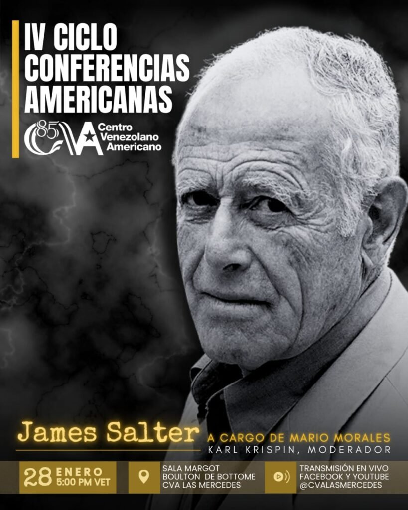 En el marco de la celebración de sus 85 años, el Centro Venezolano Americano (CVA) dará inicio al IV Ciclo de Conferencias Americanas el miércoles 28 de enero de 2026 a las 5:00 p.m., con una conferencia online a cargo del profesor y ensayista venezolano Mario Morales sobre el escritor norteamericano James Salter, que moderada por Karl Krispin, será transmitida en vivo en la Sala Margot Boulton de Bottome del CVA Las Mercedes, y a través de las plataformas de Facebook y YouTube @cvalasmercedes.