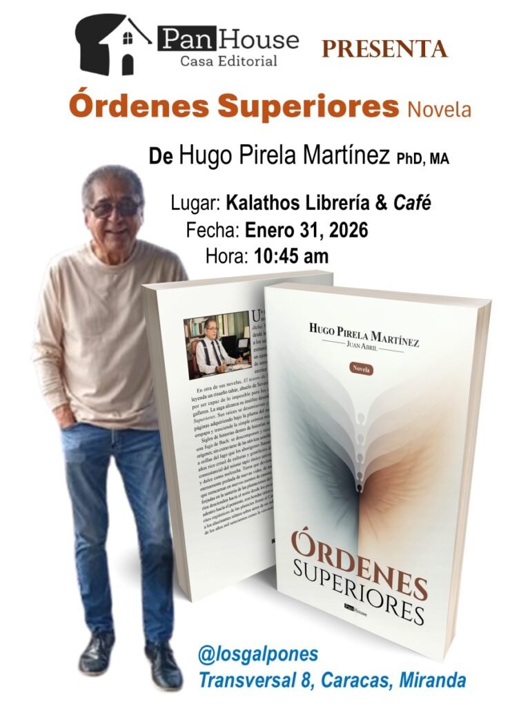 La novela “Órdenes Superiores” del escritor venezolano Hugo Pirela Martínez, publicada por la Casa Editorial Pan House, será presentada el sábado 31 de enero de 2026, a las 10:45 a.m., en un evento que tendrá lugar en la Librería Kalathos del Centro de Arte Los Galpones.