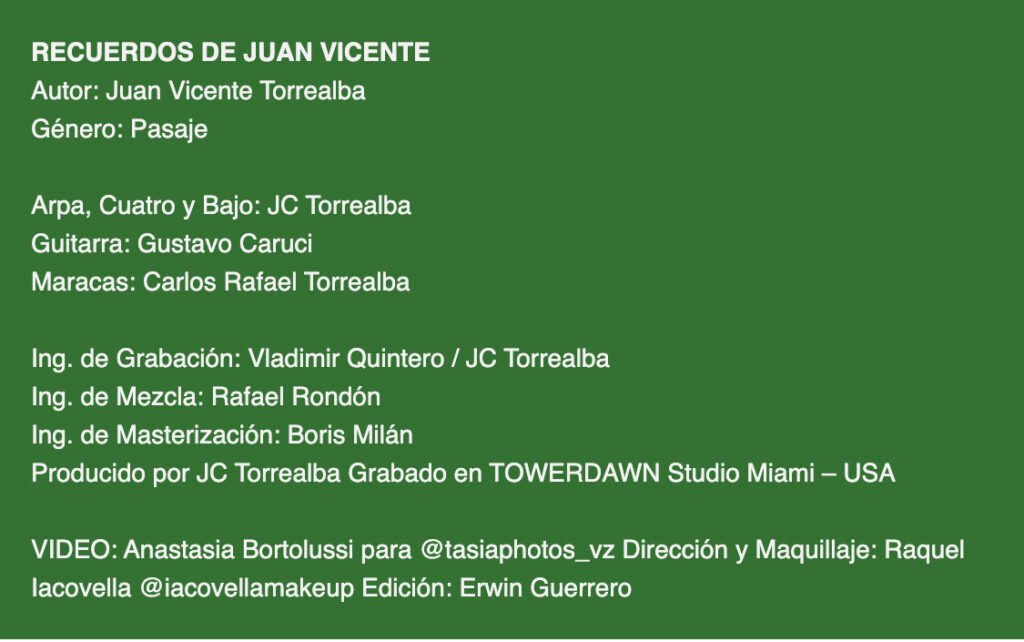 Annaé Torrealba -quien sigue trabajando por la difusión de la cultura venezolana tras treinta y un años de carrera artística, en los que ha lanzado siete álbumes de estudio-; agrega que esta versión de este tema -letra y música del legendario arpista-, cuenta con la producción musical, arreglos, arpa y bajo de JC Torrealba, la guitarra de Gustavo Carucí y, en las maracas, Carlos Rafael Torrealba. La Ingeniería de sonido estuvo a cargo de Boris Milan, Vladimir Quintero y Rafael Rondon (+).