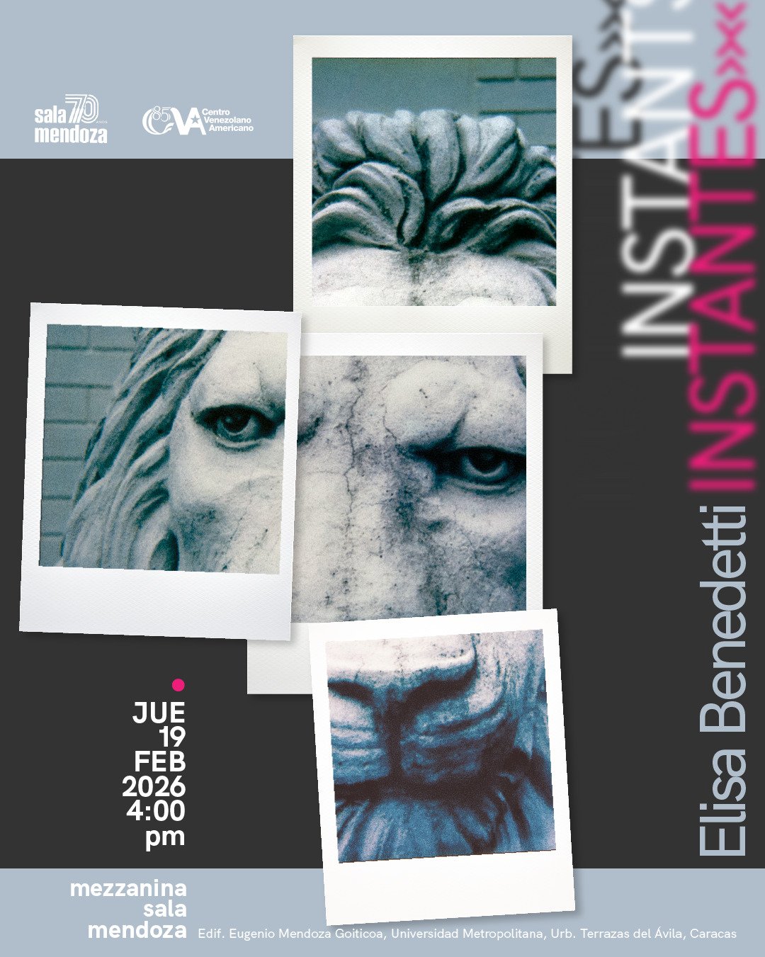 Una exposición de la fotógrafa venezolana Elisa Benedetti será inaugurada bajo el título “Instantes”, el jueves 19 de febrero de 2026 a las 4:00 p.m., en la Sala Mendoza, en alianza con el Centro Venezolano Americano y su programa extramuros, a través del cual el CVA desarrolla diversas actividades fuera de su sede física.