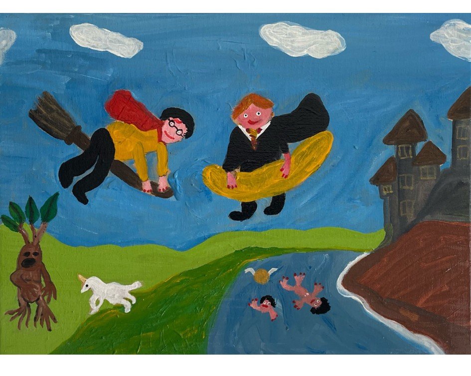 Fantasy emerges here both as a means of escape and as a distorted mirror of reality. Angels float without solemnity, animals accompany or threaten, characters fly, fall, or precariously sustain themselves within improbable landscapes. These elements do not function as closed symbols, but as narrative devices that allow desire, fear, and survival to be addressed without resorting to literal language. The painting does not explain; it suggests.
