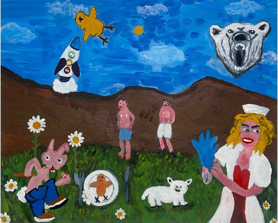 The choice of a direct, almost primary pictorial language reinforces this ambiguity. There is no pursuit of technical virtuosity or formal sophistication. The painting asserts itself through frontal presence, through a kind of urgency to say something before it disappears. This economy of means does not impoverish the discourse; on the contrary, it concentrates it. Each figure seems to be there because it cannot be otherwise.