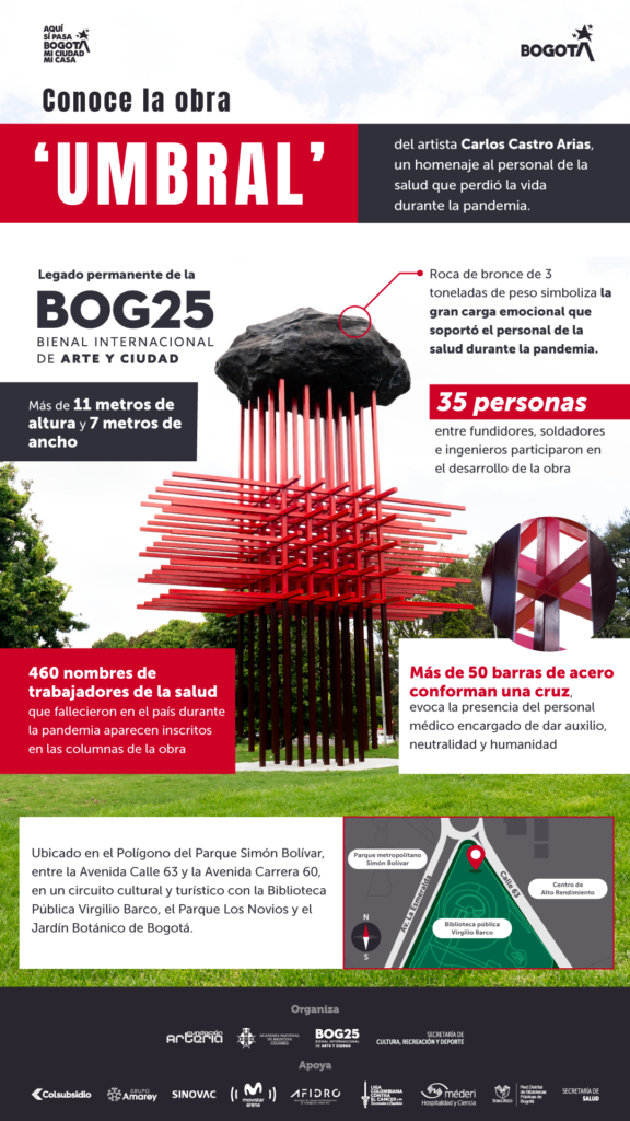 La obra ‘Umbral’, del artista bogotano Carlos Castro Arias es un reconocimiento al cuerpo médico y al personal de la salud que perdió la vida durante la pandemia del Covid-19, y se consolida como legado permanente de la Bienal Internacional de Arte y Ciudad BOG25.