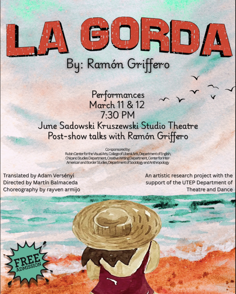 La Gorda es un proyecto de investigación artística del director e investigador teatral, chileno, Martín Balmaceda, a partir de un texto de Ramón Griffero, creador escénico reconocido por sus aportes al lenguaje escénico, quien obtuvo el Premio Loth en El Cairo por su contribución al desarrollo del teatro contemporáneo, así como el galardón más destacado de Chile, su país, el Premio Nacional 2019. Las funciones de La Gorda serán: El 11 y 12 de marzo a las 7:30pm, con una conversación después de la función con el dramaturgo Griffero, en la sala June Sadowski Kruszewski Studio Teatro en El Paso, Texas.