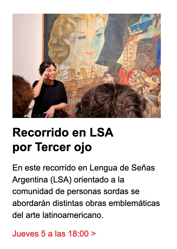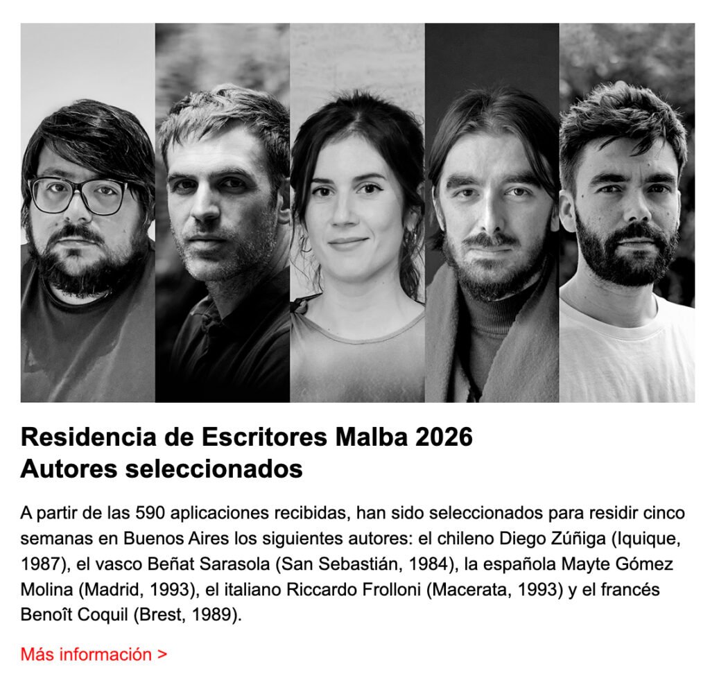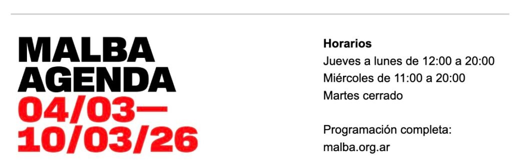 In Arte & Cultura, Eventos Agenda MALBA 04/03/2026 4 marzo, 2026 Pin It Socios Corporativos Buenos Aires – Argentina Marzo, 2026 Compártelo:Haz clic para compartir en Twitter (Se abre en una ventana nueva)Haz clic para compartir en Facebook (Se abre en una ventana nueva) Relacionado #AgendaCultural#AlejoMoguillansky#ArteLatinoamericano#ArteTextil#BuenosAires#Malba#OlgaDeAmaral#ResidenciaDeEscritores#YuzoKawashimaCine Share You may also like View Post Inauguración «Valerie Brathwaite. Un propio andar fluyente» — Jueves 6 de noviembre, 19:00 View Post Agenda MALBA 1/10/25 View Post ¡Mañana! Visita guiada de «Razón y política de la pintura» en Los Galpones de Noche View Post Este jueves: ART GUITAR en el ART NEXUS PARTY, a beneficio de la Fundación Mi Sangre de JUANES View Post Agenda semanal del Centro Cultural Chacao, desde el jueves 30 de octubre al domingo 02 de noviembre. View Post Diálogo entre el penetrable y el impenetrable. View Post ARTBO | Feria 2025. Un encuentro para el arte y todos sus públicos Previous Post Juan Vélez ¿a quién… In Eventos Juan Vélez ¿a quién le estará diciendo? “No te da la talla”. View Post