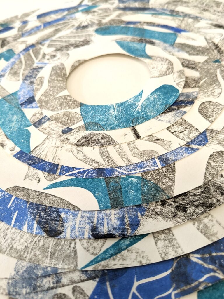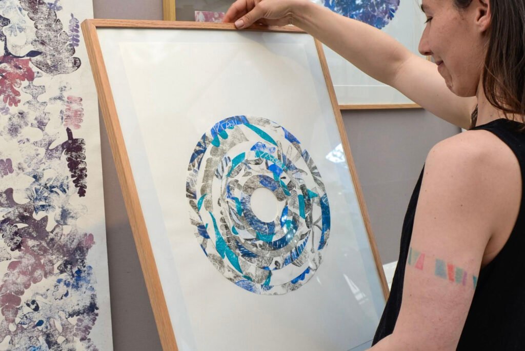 A través de técnicas como el linograbado y el textil, explora nociones de identidad, de naturaleza como sujeto, tiempo y sistema de representación, proponiendo una relación sensible entre el cuerpo, el entorno y la materia.